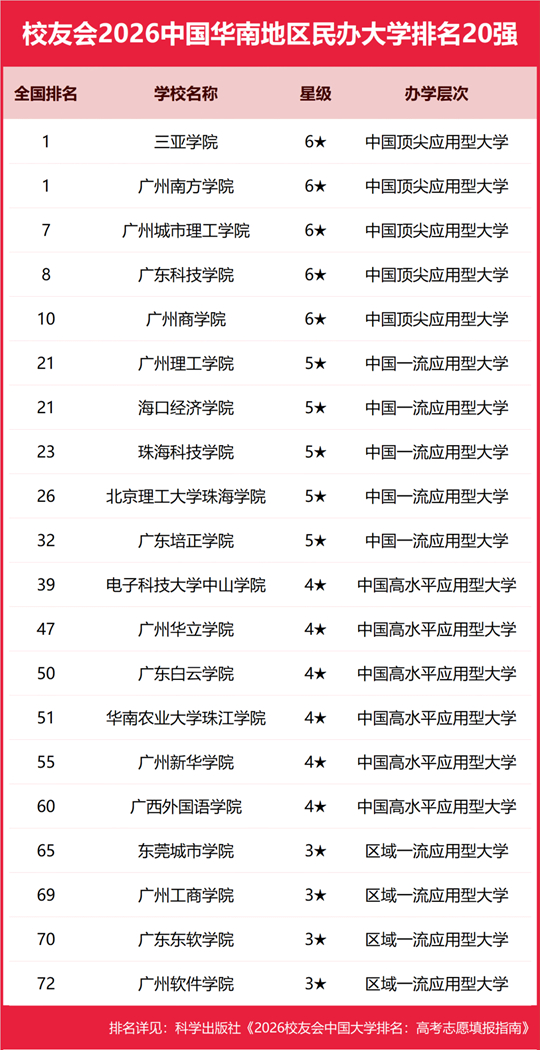 三亞學(xué)院、廣州南方學(xué)院并列2026中國華南地區(qū)民辦大學(xué)排名第一,廣州理工學(xué)院躋身前10強(qiáng)