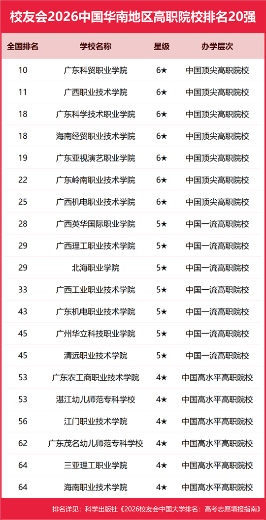 廣東科貿(mào)職業(yè)學(xué)院雄居2026中國華南地區(qū)高職院校排名第一,廣西職業(yè)技術(shù)學(xué)院躋身前3強(qiáng)
