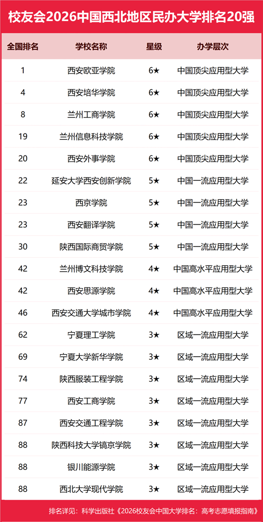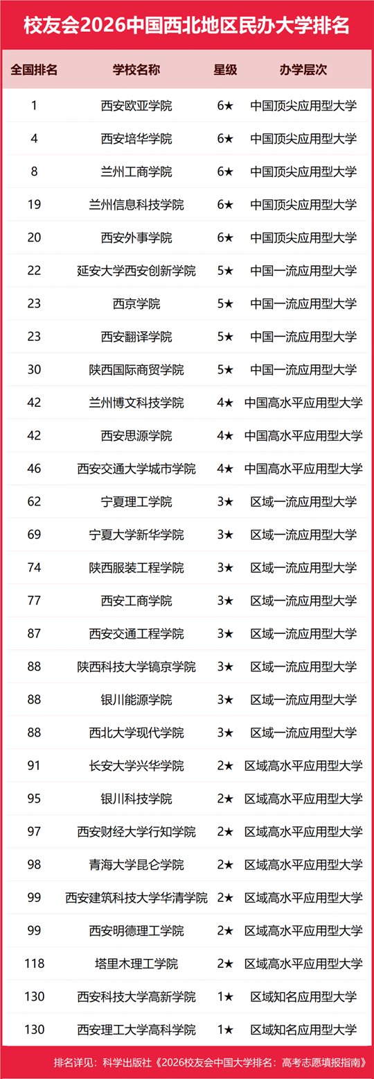 在校友會(huì)2026中國(guó)民辦大學(xué)排名中,西安歐亞學(xué)院全國(guó)排名第1名,雄居2026中國(guó)西北地區(qū)民辦大學(xué)排名第一。西安培華學(xué)院第2,蘭州工商學(xué)院居第3。名列前10強(qiáng)的其他民辦高校為蘭州信息科技學(xué)院、西安外事學(xué)院、延安大學(xué)西安創(chuàng)新學(xué)院、西京學(xué)院、西安翻譯學(xué)院、陜西國(guó)際商貿(mào)學(xué)院、蘭州博文科技學(xué)院、西安思源學(xué)院。