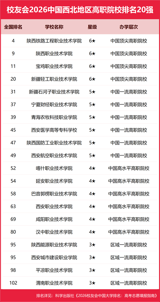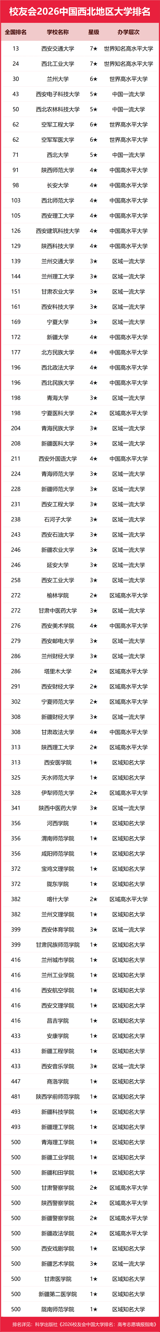 | 校友會(huì)2026中國(guó)西北地區(qū)大學(xué)排名,西安交通大學(xué)、西安歐亞學(xué)院、蘭州資源環(huán)境職業(yè)技術(shù)大學(xué)、陜西鐵路工程職業(yè)技術(shù)學(xué)院第一 |