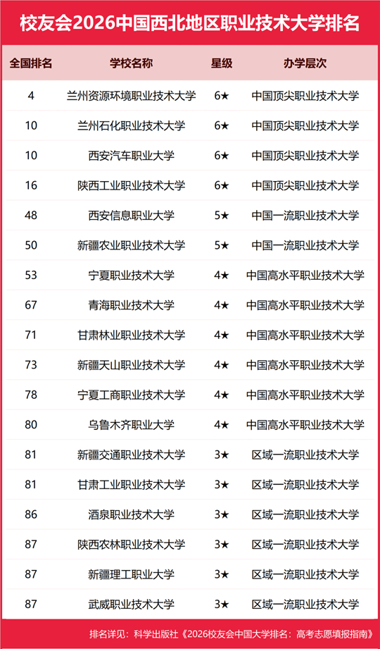 蘭州資源環(huán)境職業(yè)技術(shù)大學(xué)雄居2026中國(guó)西北地區(qū)職業(yè)技術(shù)大學(xué)排名第一,蘭州石化職業(yè)技術(shù)大學(xué)、西安汽車職業(yè)大學(xué)躋身前3強(qiáng)