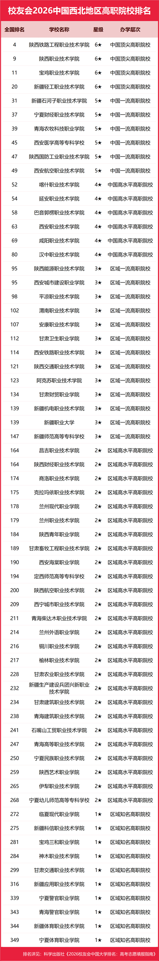 在校友會(huì)2026中國(guó)高職院校排名中,陜西鐵路工程職業(yè)技術(shù)學(xué)院全國(guó)排名第4名,雄居2026中國(guó)西北地區(qū)高職院校排名第一。陜西職業(yè)技術(shù)學(xué)院第2,寶雞職業(yè)技術(shù)學(xué)院第3。名列前10強(qiáng)的其他高職院校為新疆輕工職業(yè)技術(shù)學(xué)院、新疆石河子職業(yè)技術(shù)學(xué)院、寧夏財(cái)經(jīng)職業(yè)技術(shù)學(xué)院、青海農(nóng)牧科技職業(yè)學(xué)院、西安醫(yī)學(xué)高等?茖W(xué)校、陜西國(guó)防工業(yè)職業(yè)技術(shù)學(xué)院、西安航空職業(yè)技術(shù)學(xué)院。