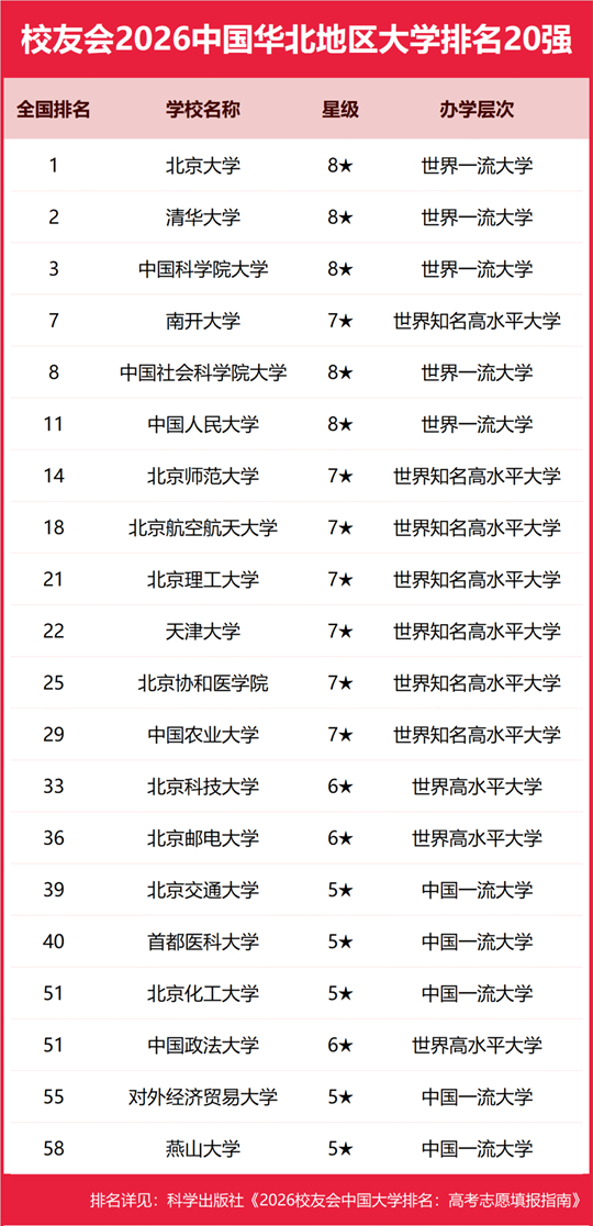 為了給2026年全國高考考生報考中國華北地區(qū)高校提供參考指南,2026年1月12日,全國第三方大學(xué)評價機(jī)構(gòu)艾瑞深校友會網(wǎng)(Cuaa.net)撰寫完成、科學(xué)出版社即將出版的《2026校友會中國大學(xué)排名:高考志愿填報指南》最新發(fā)布校友會2026中國華北地區(qū)大學(xué)排名。北京大學(xué)連續(xù)20年蟬聯(lián)中國大學(xué)排名冠軍,穩(wěn)居霸主地位,問鼎2026中國大學(xué)排名榜首。清華大學(xué)第二,中國科學(xué)院大學(xué)和浙江大學(xué)并列第三,南開大學(xué)挺進(jìn)全國前七,西湖大學(xué)、南方科技大學(xué)和上?萍即髮W(xué)挺進(jìn)全國20強(qiáng);福耀科技大學(xué)首次納入中國大學(xué)排名,躋身全國50強(qiáng)。