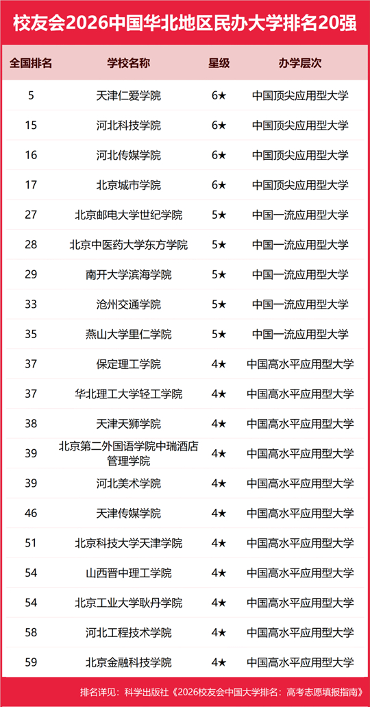 在校友會2026中國民辦大學(xué)排名中,天津仁愛學(xué)院全國排名第5名,雄居2026中國華北地區(qū)民辦大學(xué)排名第一。河北科技學(xué)院第2,河北傳媒學(xué)院居第3。名列前10強(qiáng)的其他民辦高校為北京城市學(xué)院、北京郵電大學(xué)世紀(jì)學(xué)院、北京中醫(yī)藥大學(xué)東方學(xué)院、南開大學(xué)濱海學(xué)院、滄州交通學(xué)院、燕山大學(xué)里仁學(xué)院、保定理工學(xué)院、華北理工大學(xué)輕工學(xué)院。