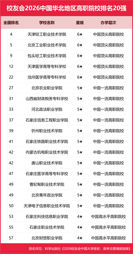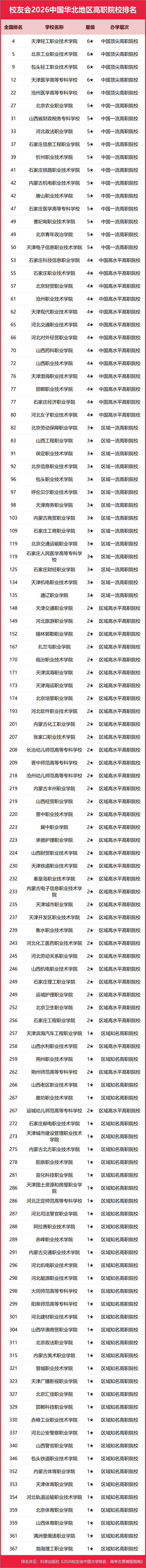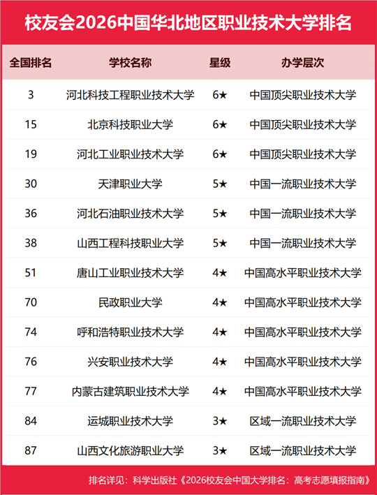 河北科技工程職業(yè)技術(shù)大學(xué)雄居2026中國華北地區(qū)職業(yè)技術(shù)大學(xué)排名第一,北京科技職業(yè)大學(xué)躋身前3強(qiáng)