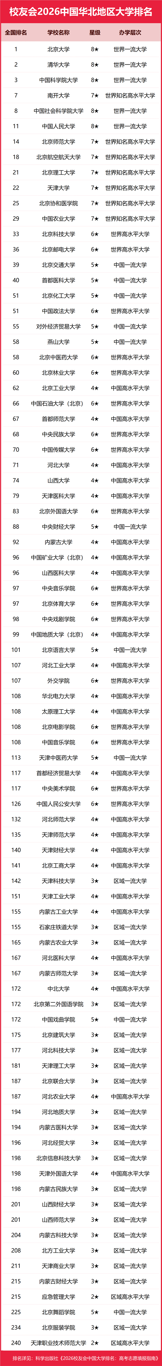 | 校友會2026中國華北地區(qū)大學(xué)排名,北京大學(xué)、天津仁愛學(xué)院、河北科技工程職業(yè)技術(shù)大學(xué)、天津輕工職業(yè)技術(shù)學(xué)院第一 |