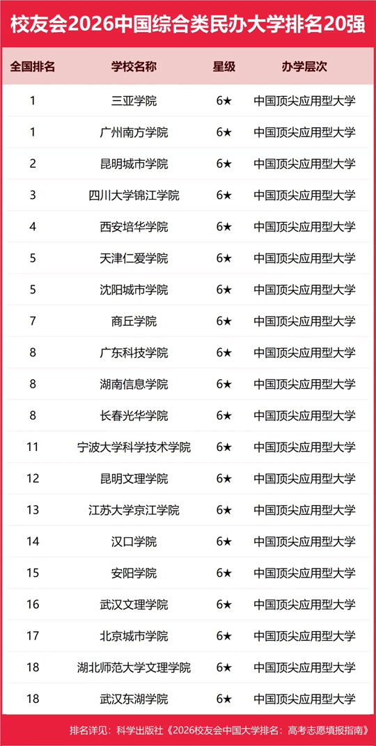 在校友會(huì)2026中國(guó)民辦大學(xué)排名中,三亞學(xué)院、廣州南方學(xué)院全國(guó)排名并列第1名,雄居2026中國(guó)綜合類民辦大學(xué)排名并列第一。昆明城市學(xué)院居第3。名列前10強(qiáng)的其他民辦高校為四川大學(xué)錦江學(xué)院、西安培華學(xué)院、天津仁愛學(xué)院、沈陽城市學(xué)院、商丘學(xué)院、廣東科技學(xué)院、湖南信息學(xué)院、長(zhǎng)春光華學(xué)院。