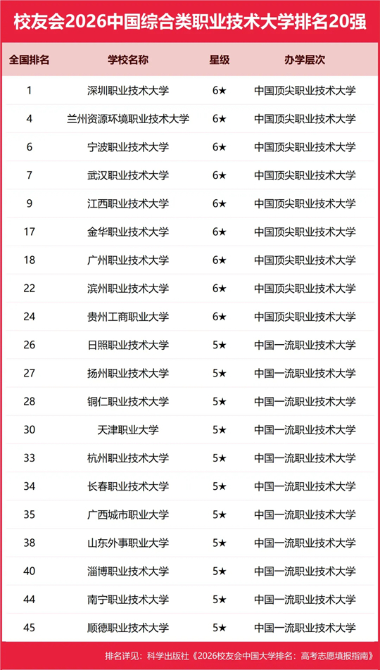 在校友會(huì)2026中國(guó)職業(yè)技術(shù)大學(xué)排名中,深圳職業(yè)技術(shù)大學(xué)全國(guó)排名第1名,雄居2026中國(guó)綜合類職業(yè)技術(shù)大學(xué)排名第一。蘭州資源環(huán)境職業(yè)技術(shù)大學(xué)列第2,寧波職業(yè)技術(shù)大學(xué)居第3。名列前10強(qiáng)的其他職業(yè)技術(shù)大學(xué)為武漢職業(yè)技術(shù)大學(xué)、江西職業(yè)技術(shù)大學(xué)、金華職業(yè)技術(shù)大學(xué)、廣州職業(yè)技術(shù)大學(xué)、濱州職業(yè)技術(shù)大學(xué)、貴州工商職業(yè)大學(xué)、日照職業(yè)技術(shù)大學(xué)、揚(yáng)州職業(yè)技術(shù)大學(xué)。