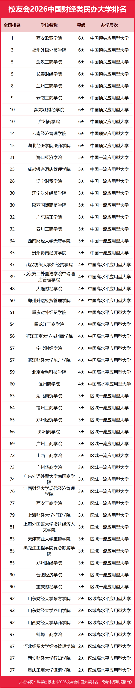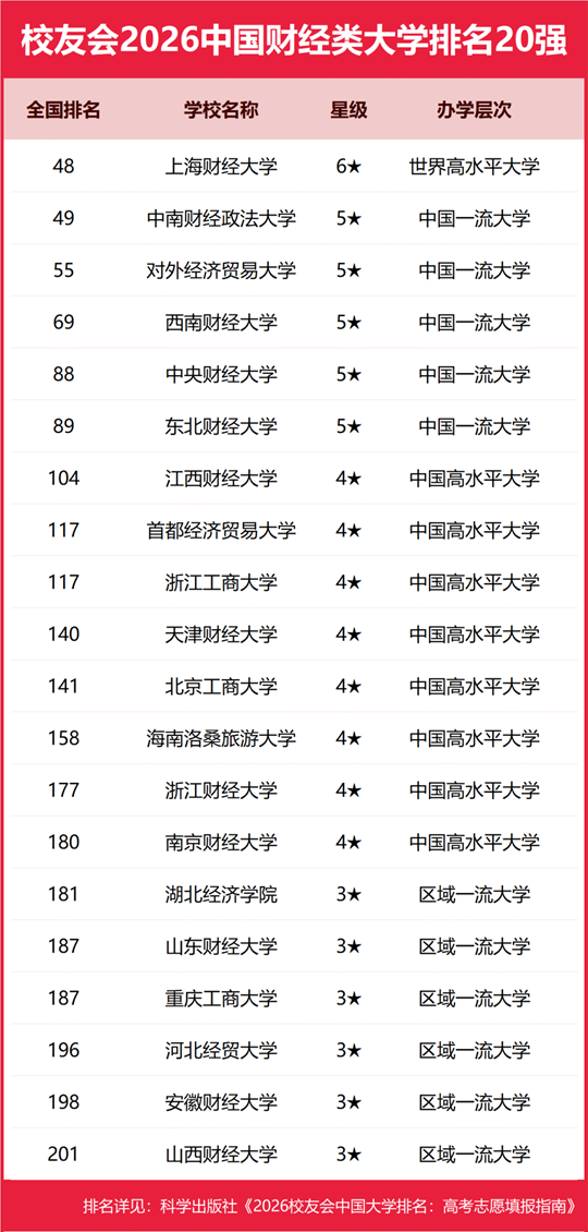 | 校友會2026中國財(cái)經(jīng)類大學(xué)排名,上海財(cái)經(jīng)大學(xué)、西安歐亞學(xué)院、廣東工商職業(yè)技術(shù)大學(xué)、浙江金融職業(yè)學(xué)院第一 |