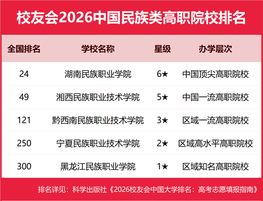 榜單顯示,中央民族大學(xué)問(wèn)鼎校友會(huì)2026中國(guó)民族類大學(xué)排名首位,湖南民族職業(yè)學(xué)院?jiǎn)柖?026中國(guó)民族類高職院校排名冠軍。