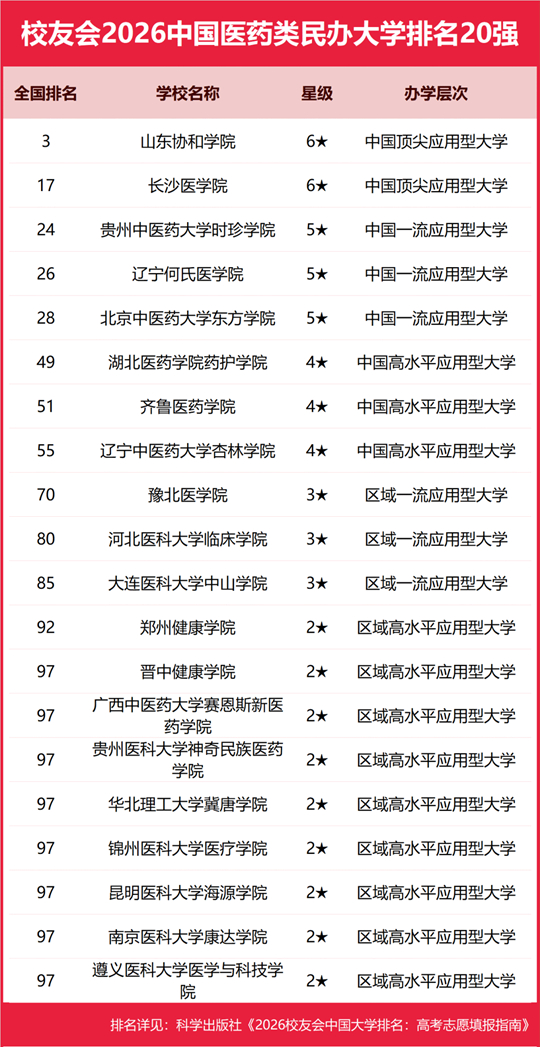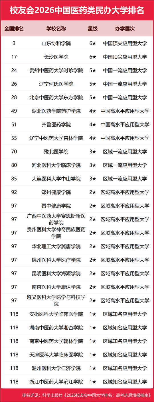 在校友會(huì)2026中國(guó)民辦大學(xué)排名中,山東協(xié)和學(xué)院全國(guó)排名第3名,雄居2026中國(guó)醫(yī)藥類民辦大學(xué)排名第一。長(zhǎng)沙醫(yī)學(xué)院第2,貴州中醫(yī)藥大學(xué)時(shí)珍學(xué)院居第3。名列前10強(qiáng)的其他民辦高校為遼寧何氏醫(yī)學(xué)院、北京中醫(yī)藥大學(xué)東方學(xué)院、湖北醫(yī)藥學(xué)院藥護(hù)學(xué)院、齊魯醫(yī)藥學(xué)院、遼寧中醫(yī)藥大學(xué)杏林學(xué)院、豫北醫(yī)學(xué)院、河北醫(yī)科大學(xué)臨床學(xué)院。