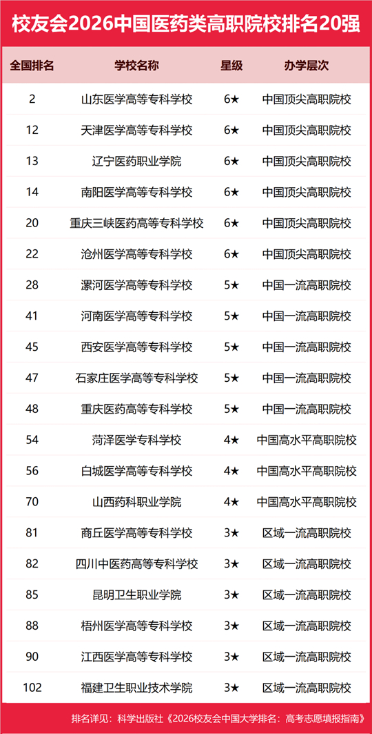 山東醫(yī)學(xué)高等專科學(xué)校雄居2026中國(guó)醫(yī)藥類高職院校排名第一,遼寧醫(yī)藥職業(yè)學(xué)院躋身前3強(qiáng)