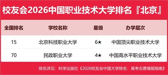 北京科技職業(yè)大學(xué)雄居2026北京市職業(yè)技術(shù)大學(xué)排名第一,民政職業(yè)大學(xué)院躋身前3強(qiáng)