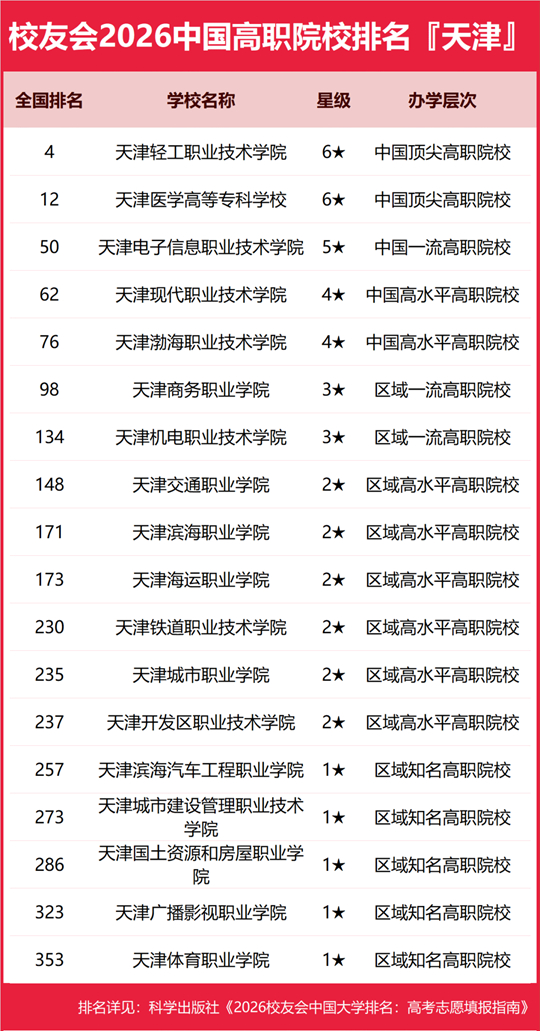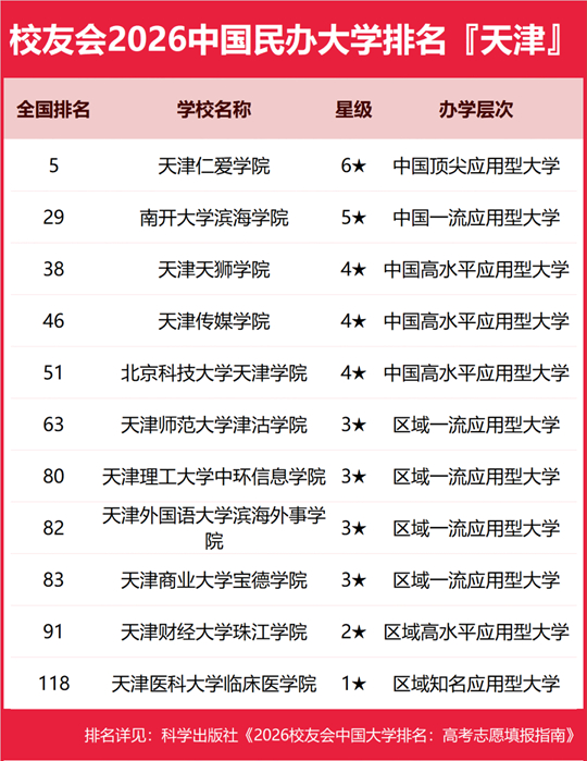 榜單顯示,南開大學(xué)問鼎校友會(huì)2026天津市大學(xué)排名首位,天津仁愛學(xué)院位列2026天津市民辦大學(xué)排名第一,天津職業(yè)大學(xué)位居2026天津市職業(yè)技術(shù)大學(xué)排名榜首,天津輕工職業(yè)技術(shù)學(xué)院?jiǎn)柖?026天津市高職院校排名冠軍。