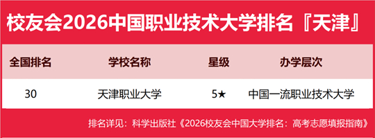 在校友會(huì)2026中國職業(yè)技術(shù)大學(xué)排名中,天津職業(yè)大學(xué)全國排名第30名,雄居2026天津市職業(yè)技術(shù)大學(xué)排名第一。
