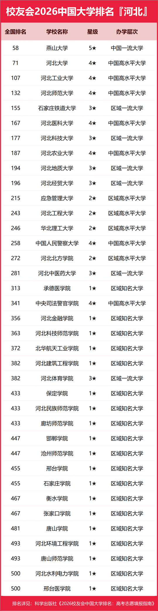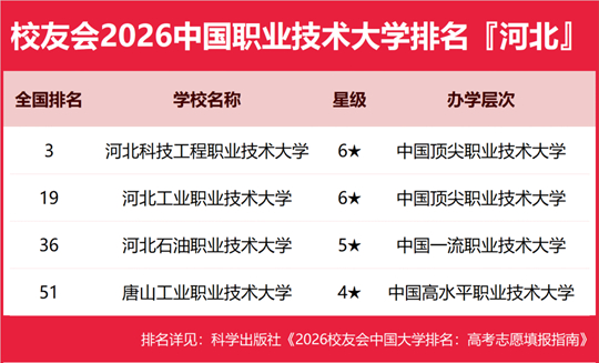 榜單顯示,燕山大學(xué)問鼎校友會(huì)2026河北省大學(xué)排名首位,河北科技學(xué)院位列2026河北省民辦大學(xué)排名第一,河北科技工程職業(yè)技術(shù)大學(xué)位居2026河北省職業(yè)技術(shù)大學(xué)排名榜首,滄州醫(yī)學(xué)高等專科學(xué)校問鼎2026河北省高職院校排名冠軍。
