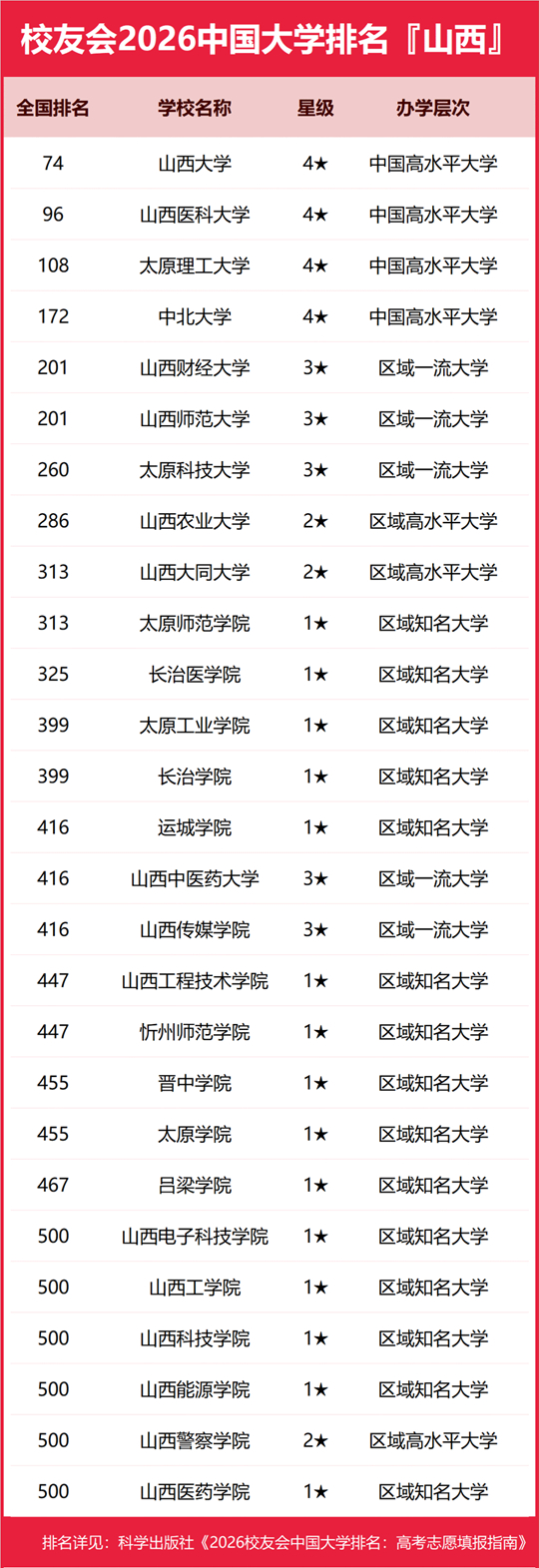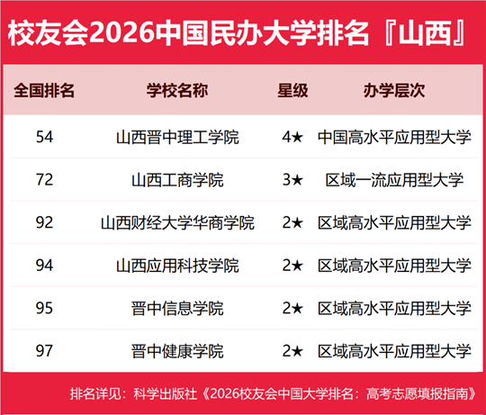 | 校友會2026山西省大學(xué)排名,山西大學(xué)、山西晉中理工學(xué)院、山西工程科技職業(yè)大學(xué)、山西省財政稅務(wù)?茖W(xué)校第一 |