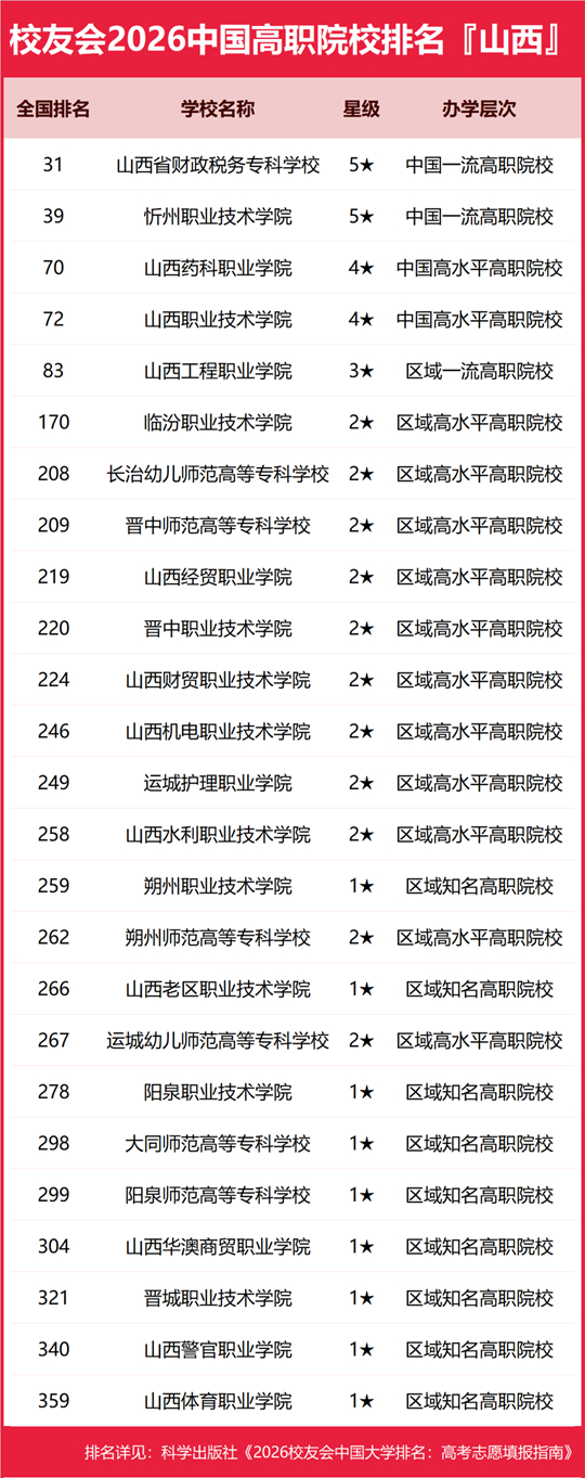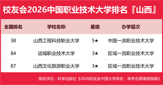 山西工程科技職業(yè)大學(xué)雄居2026山西省職業(yè)技術(shù)大學(xué)排名第一,山西文化旅游職業(yè)大學(xué)躋身前3強