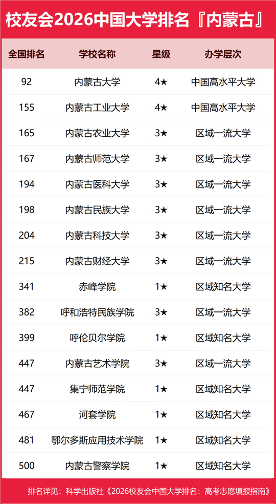 | 校友會2026內(nèi)蒙古自治區(qū)大學(xué)排名,內(nèi)蒙古大學(xué)、內(nèi)蒙古大學(xué)創(chuàng)業(yè)學(xué)院、呼和浩特職業(yè)技術(shù)大學(xué)、包頭輕工職業(yè)技術(shù)學(xué)院第一 |