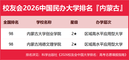 在校友會2026中國民辦大學(xué)排名中,內(nèi)蒙古大學(xué)創(chuàng)業(yè)學(xué)院、內(nèi)蒙古鴻德文理學(xué)院并列全國排名第98名。