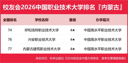 在校友會2026中國職業(yè)技術(shù)大學(xué)排名中,呼和浩特職業(yè)技術(shù)大學(xué)全國排名第74名,雄居2026內(nèi)蒙古自治區(qū)職業(yè)技術(shù)大學(xué)排名第一。興安職業(yè)技術(shù)大學(xué)列第2,內(nèi)蒙古建筑職業(yè)技術(shù)大學(xué)居第3。