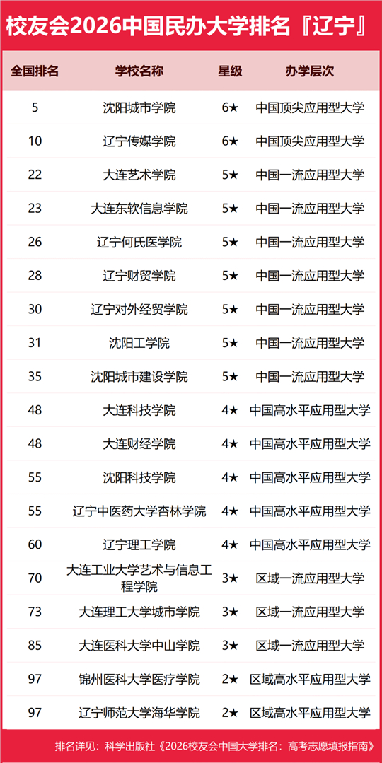 沈陽(yáng)城市學(xué)院雄居2026遼寧省民辦大學(xué)排名第一,遼寧傳媒學(xué)院躋身全國(guó)前10強(qiáng)