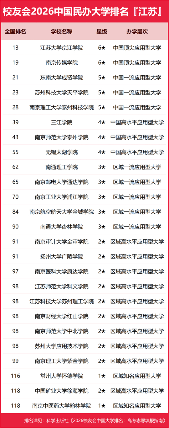 在校友會2026中國民辦大學(xué)排名中,江蘇大學(xué)京江學(xué)院全國排名第13名,雄居2026江蘇省民辦大學(xué)排名第一。南京傳媒學(xué)院第2,東南大學(xué)成賢學(xué)院居第3。名列前10強的其他民辦高校為蘇州科技大學(xué)天平學(xué)院、南京理工大學(xué)泰州科技學(xué)院、三江學(xué)院、南京師范大學(xué)泰州學(xué)院、無錫太湖學(xué)院、南通理工學(xué)院、南京郵電大學(xué)通達(dá)學(xué)院。