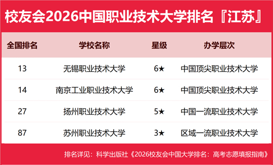 無錫職業(yè)技術(shù)大學(xué)雄居2026江蘇省職業(yè)技術(shù)大學(xué)排名第一,南京工業(yè)職業(yè)技術(shù)大學(xué)院躋身前3強