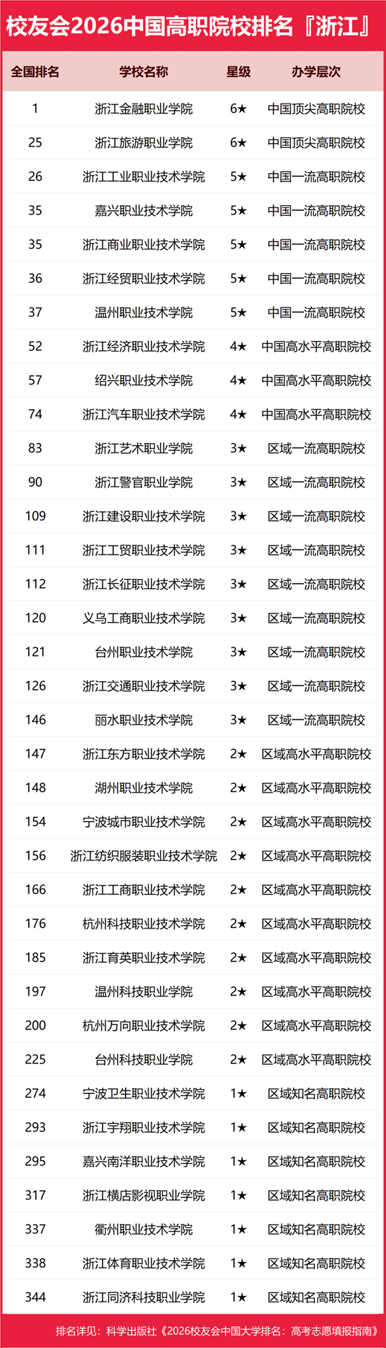在校友會(huì)2026中國(guó)高職院校排名中,浙江金融職業(yè)學(xué)院全國(guó)排名第1名,雄居2026浙江省高職院校排名第一。浙江旅游職業(yè)學(xué)院第2,浙江工業(yè)職業(yè)技術(shù)學(xué)院第3。名列前10強(qiáng)的其他高職院校為嘉興職業(yè)技術(shù)學(xué)院、浙江商業(yè)職業(yè)技術(shù)學(xué)院、浙江經(jīng)貿(mào)職業(yè)技術(shù)學(xué)院、溫州職業(yè)技術(shù)學(xué)院、浙江經(jīng)濟(jì)職業(yè)技術(shù)學(xué)院、紹興職業(yè)技術(shù)學(xué)院、浙江汽車職業(yè)技術(shù)學(xué)院。