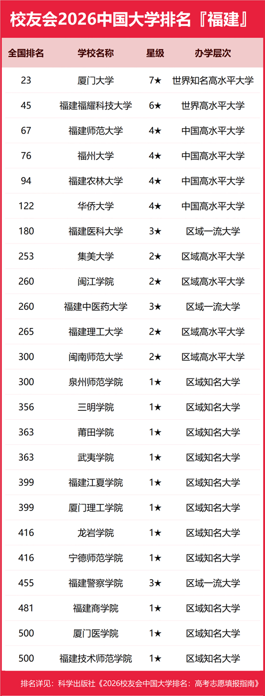 在最新校友會2026中國大學排名中,廈門大學全國排名第23名,雄居2026福建省大學排名第一。福建福耀科技大學第2,福建師范大學第3。名列前10強的其他高校為福州大學、福建農(nóng)林大學、華僑大學、福建醫(yī)科大學、集美大學、閩江學院、福建中醫(yī)藥大學。