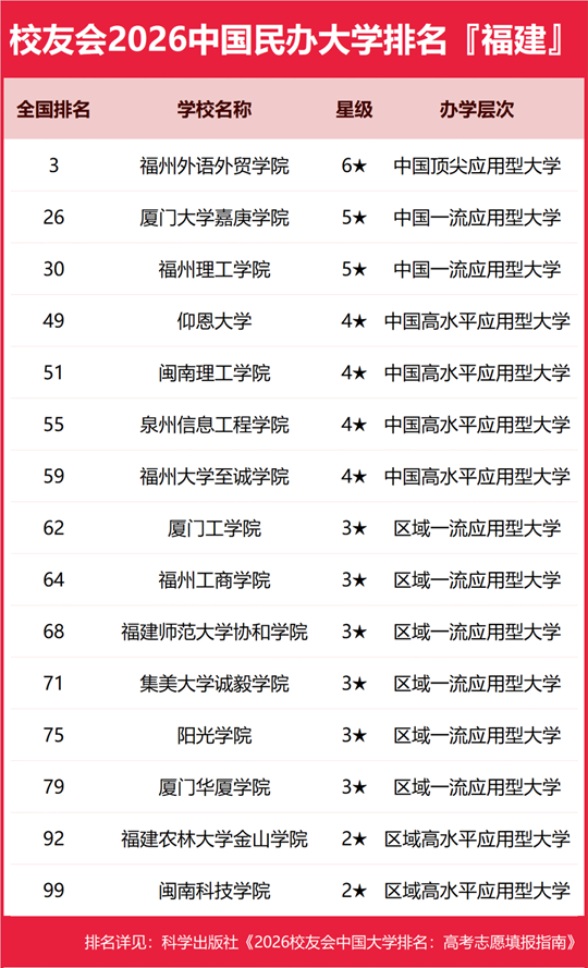 | 校友會2026福建省大學排名,廈門大學、福州外語外貿(mào)學院、黎明職業(yè)大學、廈門海洋職業(yè)技術(shù)學院第一 |