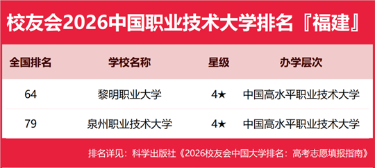 在校友會2026中國職業(yè)技術(shù)大學排名中,黎明職業(yè)大學全國排名第64名,雄居2026福建省職業(yè)技術(shù)大學排名第一。泉州職業(yè)技術(shù)大學列第2。