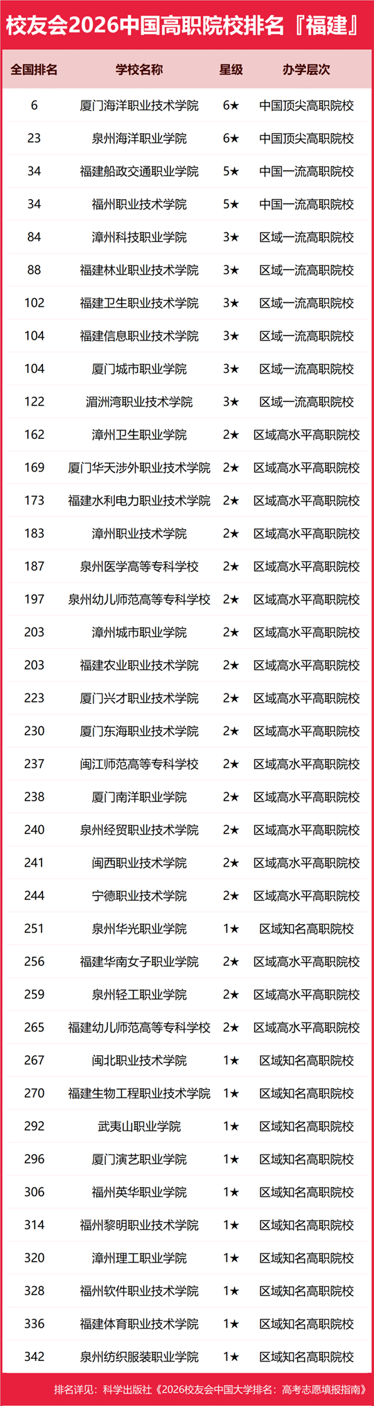 在校友會2026中國高職院校排名中,廈門海洋職業(yè)技術(shù)學院全國排名第6名,雄居2026福建省高職院校排名第一。泉州海洋職業(yè)學院第2,福建船政交通職業(yè)學院、福州職業(yè)技術(shù)學院并列第3。名列前10強的其他高職院校為漳州科技職業(yè)學院、福建林業(yè)職業(yè)技術(shù)學院、福建衛(wèi)生職業(yè)技術(shù)學院、福建信息職業(yè)技術(shù)學院、廈門城市職業(yè)學院、湄洲灣職業(yè)技術(shù)學院。