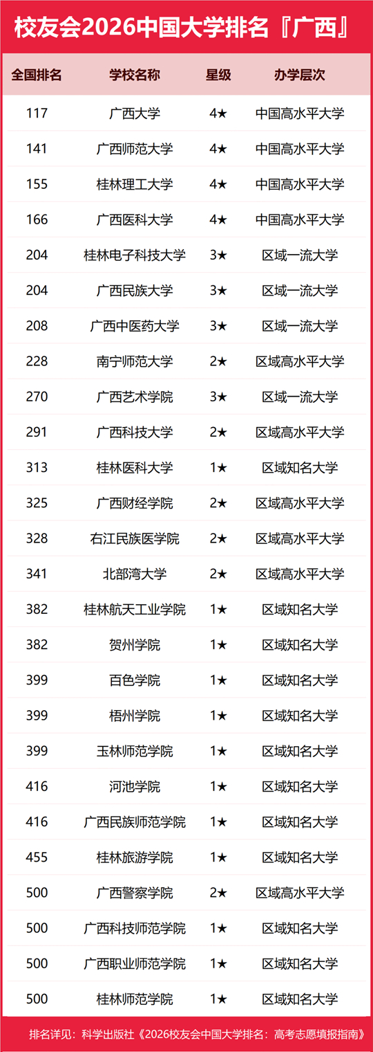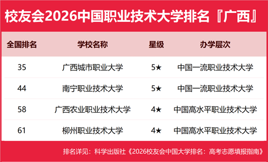 | 校友會2026廣西壯族自治區(qū)大學(xué)排名,廣西大學(xué)、廣西外國語學(xué)院、廣西城市職業(yè)大學(xué)、廣西職業(yè)技術(shù)學(xué)院第一 |