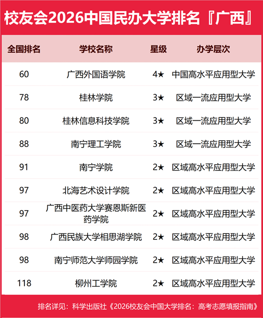 榜單顯示,廣西大學(xué)問鼎校友會2026廣西壯族自治區(qū)大學(xué)排名首位,廣西外國語學(xué)院位列2026廣西壯族自治區(qū)民辦大學(xué)排名第一,廣西城市職業(yè)大學(xué)位居2026廣西壯族自治區(qū)職業(yè)技術(shù)大學(xué)排名榜首,廣西職業(yè)技術(shù)學(xué)院問鼎2026廣西壯族自治區(qū)高職院校排名冠軍。