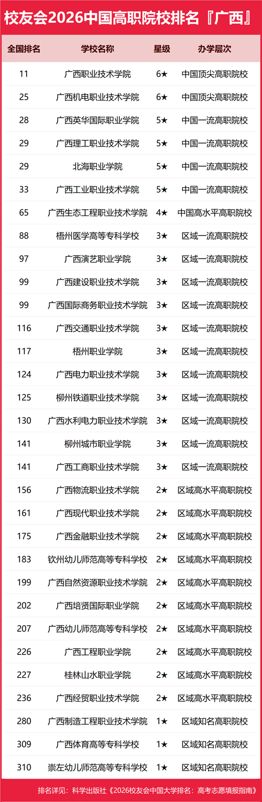 在校友會2026中國高職院校排名中,廣西職業(yè)技術(shù)學(xué)院全國排名第11名,雄居2026廣西壯族自治區(qū)高職院校排名第一。廣西機電職業(yè)技術(shù)學(xué)院第2,廣西英華國際職業(yè)學(xué)院第3。名列前10強的其他高職院校為廣西理工職業(yè)技術(shù)學(xué)院、北海職業(yè)學(xué)院、廣西工業(yè)職業(yè)技術(shù)學(xué)院、廣西生態(tài)工程職業(yè)技術(shù)學(xué)院、梧州醫(yī)學(xué)高等?茖W(xué)校、廣西演藝職業(yè)學(xué)院、廣西建設(shè)職業(yè)技術(shù)學(xué)院。