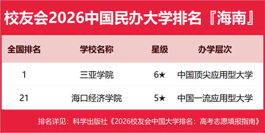 在校友會2026中國民辦大學排名中,三亞學院全國排名第1名,雄居2026海南省民辦大學排名第一。?诮(jīng)濟學院第2。
