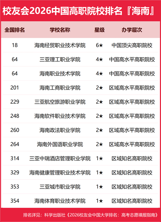 在校友會2026中國高職院校排名中,海南經(jīng)貿(mào)職業(yè)技術學院全國排名第18名,雄居2026海南省高職院校排名第一。三亞理工職業(yè)學院、海南職業(yè)技術學院并列第2。名列前10強的其他高職院校為海南工商職業(yè)學院、三亞航空旅游職業(yè)學院、海南軟件職業(yè)技術學院、海南政法職業(yè)學院、海南外國語職業(yè)學院、三亞中瑞酒店管理職業(yè)學院、海南健康管理職業(yè)技術學院。