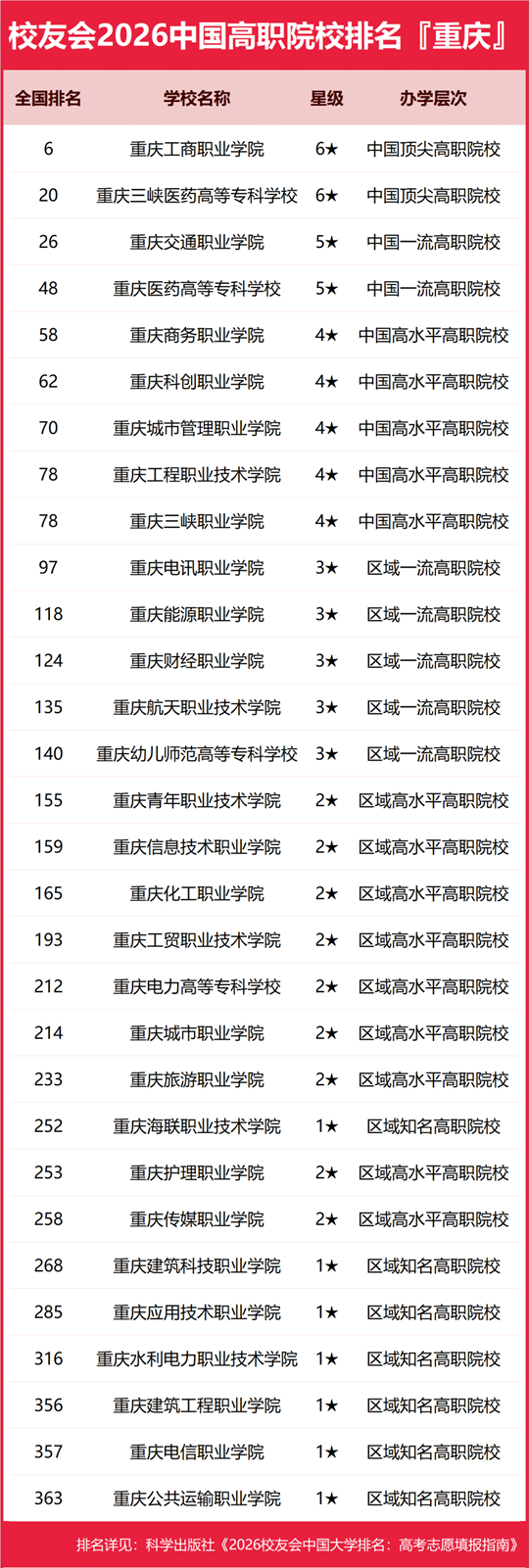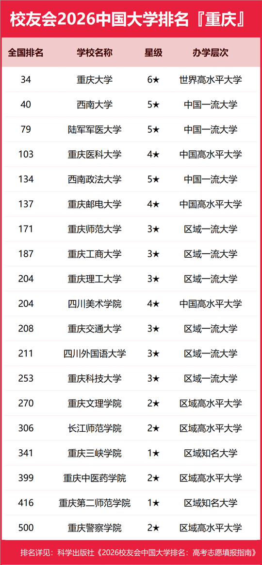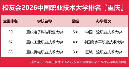 | 校友會2026重慶市大學排名,重慶大學、重慶城市科技學院、重慶電子科技職業(yè)大學、重慶工商職業(yè)學院第一 |