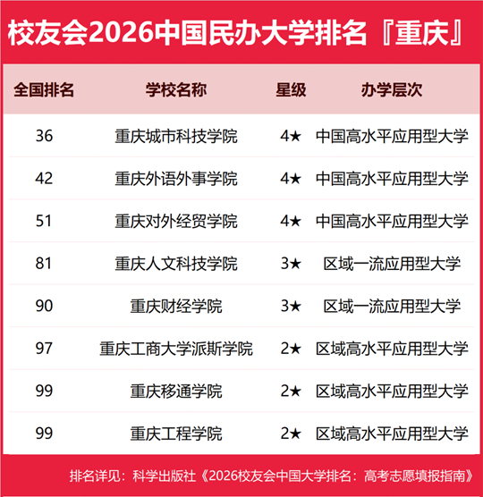 在校友會2026中國民辦大學排名中,重慶城市科技學院全國排名第36名,雄居2026重慶市民辦大學排名第一。重慶外語外事學院第2,重慶對外經(jīng)貿(mào)學院居第3。名列前10強的其他民辦高校為重慶人文科技學院、重慶財經(jīng)學院、重慶工商大學派斯學院、重慶移通學院、重慶工程學院。