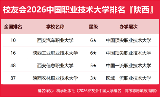 西安汽車(chē)職業(yè)大學(xué)雄居2026陜西省職業(yè)技術(shù)大學(xué)排名第一,西安信息職業(yè)大學(xué)院躋身前3強(qiáng)