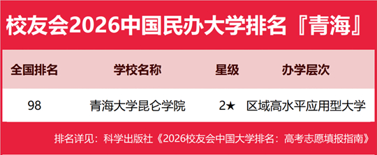 在校友會2026中國民辦大學(xué)排名中,青海大學(xué)昆侖學(xué)院全國排名第98名,雄居2026青海省民辦大學(xué)排名第一。