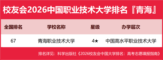 在校友會2026中國職業(yè)技術(shù)大學(xué)排名中,青海職業(yè)技術(shù)大學(xué)全國排名第67名,雄居2026青海省職業(yè)技術(shù)大學(xué)排名第一。