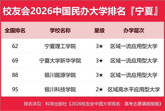 在校友會2026中國民辦大學(xué)排名中,寧夏理工學(xué)院全國排名第62名,雄居2026寧夏回族自治區(qū)民辦大學(xué)排名第一。寧夏大學(xué)新華學(xué)院第2,銀川能源學(xué)院居第3。名列前10強的其他民辦高校為銀川科技學(xué)院。