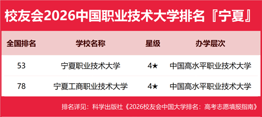 在校友會2026中國職業(yè)技術(shù)大學(xué)排名中,寧夏職業(yè)技術(shù)大學(xué)全國排名第53名,雄居2026寧夏回族自治區(qū)職業(yè)技術(shù)大學(xué)排名第一。寧夏工商職業(yè)技術(shù)大學(xué)列第2。