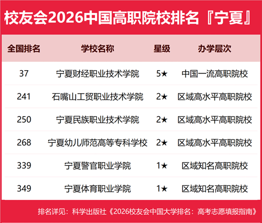 在校友會2026中國高職院校排名中,寧夏財經(jīng)職業(yè)技術(shù)學(xué)院全國排名第37名,雄居2026寧夏回族自治區(qū)高職院校排名第一。石嘴山工貿(mào)職業(yè)技術(shù)學(xué)院第2,寧夏民族職業(yè)技術(shù)學(xué)院第3。名列前10強的其他高職院校為寧夏幼兒師范高等?茖W(xué)校、寧夏警官職業(yè)學(xué)院、寧夏體育職業(yè)學(xué)院。
