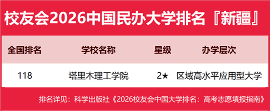 在校友會(huì)2026中國民辦大學(xué)排名中,塔里木理工學(xué)院全國排名第118名,雄居2026新疆維吾爾自治區(qū)民辦大學(xué)排名第一。