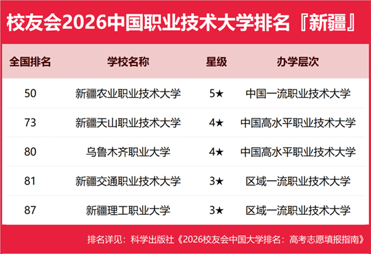 | 校友會(huì)2026新疆維吾爾自治區(qū)大學(xué)排名,新疆大學(xué)、塔里木理工學(xué)院、新疆農(nóng)業(yè)職業(yè)技術(shù)大學(xué)、新疆輕工職業(yè)技術(shù)學(xué)院第一 |