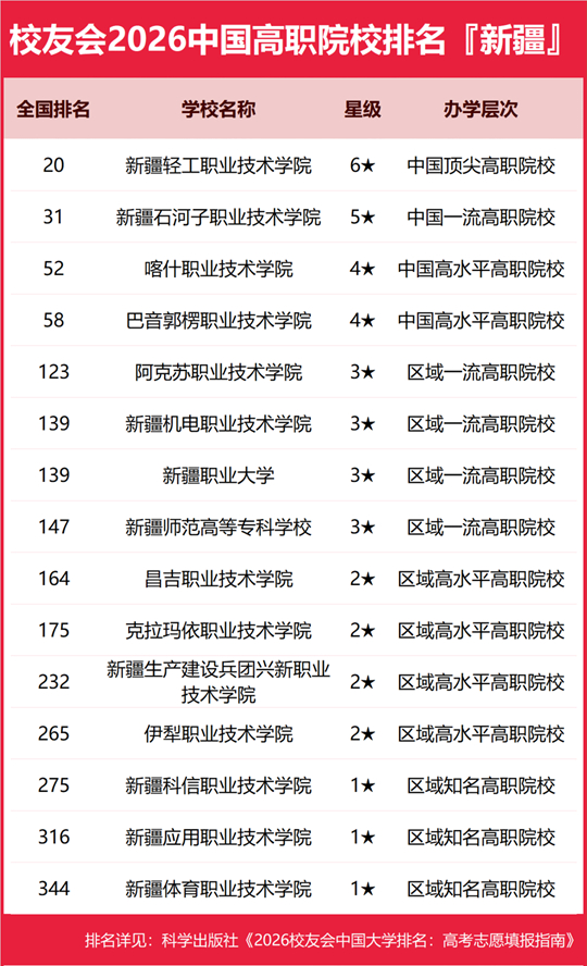 新疆輕工職業(yè)技術(shù)學(xué)院雄居2026新疆維吾爾自治區(qū)高職院校排名第一,新疆石河子職業(yè)技術(shù)學(xué)院躋身前3強(qiáng)