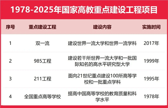 1978年至今,全國(guó)共有北京大學(xué)、清華大學(xué)、中國(guó)科學(xué)院大學(xué)、浙江大學(xué)、復(fù)旦大學(xué)、上海交通大學(xué)、南京大學(xué)、南開(kāi)大學(xué)、武漢大學(xué)、華中科技大學(xué)、中國(guó)人民大學(xué),以及燕山大學(xué)、江蘇大學(xué)、陜西科技大學(xué)、東北石油大學(xué)等158所大學(xué)入圍國(guó)家雙一流、985工程、211工程、全國(guó)重點(diǎn)高等學(xué)校等四大重點(diǎn)高校建設(shè)名單,這些院校均是中國(guó)綜合實(shí)力強(qiáng)、辦學(xué)水平高、國(guó)家定位高的中國(guó)重點(diǎn)大學(xué)。